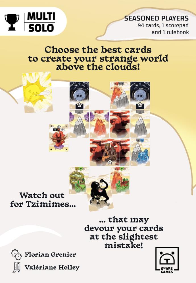 In Strange World Above the Clouds, you have to make the best of the worst. Indeed, with a very "tight" 3-card draft, your playing partners are bound to give you cards that are difficult to place in your playing area. But from this constrained optimization comes the pleasure of the game.